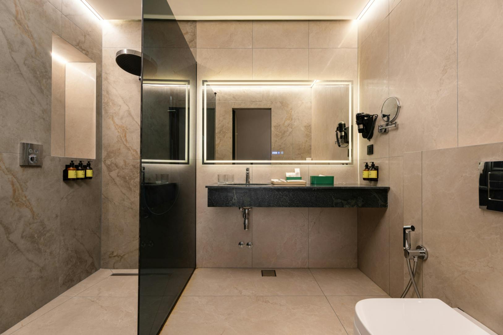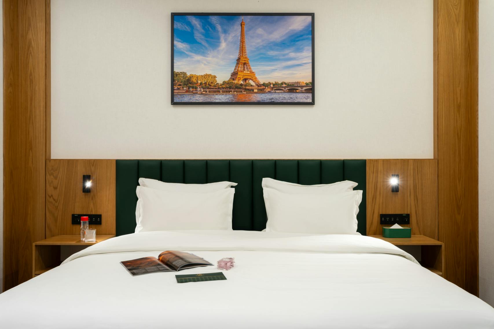 Guests can enjoy modern comforts including smart TVs, complimentary Wi-Fi, an espresso machine, minibar, and work areas. The bathrooms feature walk-in showers, fresh towels, and premium toiletries. Large windows open to a tranquil courtyard view, creating a peaceful retreat in the heart of the city.